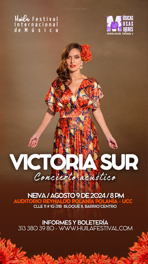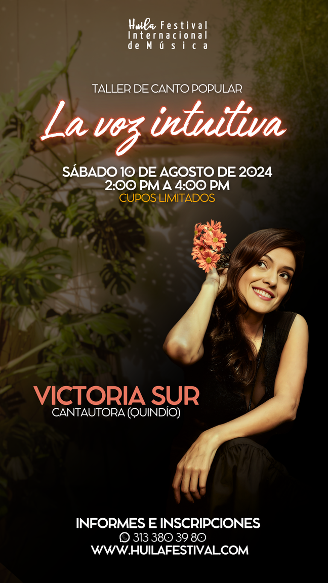 Victoria Sur, la cantautora colombiana estará en la ciudad capital para deleitar a huilenses y visitantes con su música, saberes y conocimientos, pues como parte de la interesante programación artística, académica y cultural que desde el 8 al 11 de agosto de 2024 ofrecerá la temporada, la artista conocerá a la ciudadanía en el evento de bienvenida Un café especial con Victoria en Trópicos (Cra 5 #11-06, Centro), presentará un show escénico íntimo y extraordinario que además trae novedades y lanzamientos para el mundo, cuya boletería y reservas ya están disponibles a través del sitio web del festival y la cuenta de WhatsApp 313 380 3980, y además orientará el Taller de técnica vocal “La voz intuitiva” al cual podrán inscribirse aficionados y profesionales del canto a través de www.huilafestival.com